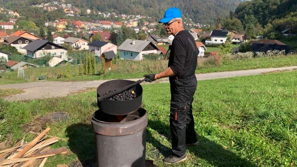 V tem času se je izza stavbe že začelo kaditi. Jože je pripravil ogenj, v vodo namočil kostanje in jih strokovno pripravil.